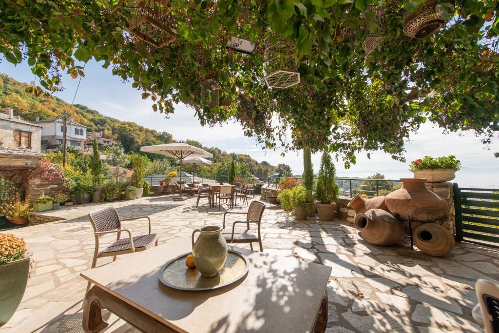 Το χαγιάτι, με ταυτόχρονη θέα στη θάλασσα και το βουνό, συνδυάζει τη φυσική ομορφιά με τη ρουστίκ γοητεία, δημιουργώντας μια αξέχαστη ορεινή εμπειρία.